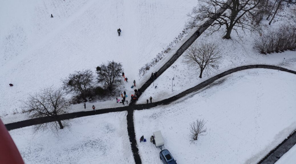 Vi valgte at lande tæt på Bisgaardsvej, hvor jeg bor. Så kunne vi lige tage hen og få den medbragte kaffe og kage i varmen indendørs.